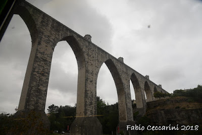 Sono indeciso sulla direzione del binario. Vicino ai binari non ci sono display luminosi che indicano gli arrivi dei treni. Chiedo ad un ragazzo che si avvicina per chiedermi degli spiccioli e mi dice che il binario è quello giusto. Ancora non convinto chiedo ad una signora di mezza età con una bambina. “Scusi, per Pragal è il binario giusto?” Non devo aver pronunciato correttamente il nome della località e la signora stenta un po’ a capire la mia domanda, poi mi conferma che stiamo sul binario giusto. Il treno che arriva è un lungo intercity. Saliamo e ci sediamo ma subito due ragazze ci fanno alzare perché ci dicono di avere quei posti prenotati. Sorridiamo con cortese imbarazzo, chiediamo scusa e ci dirigiamo verso un divanetto completamente libero. Ci domandiamo se in Portogallo si prenotano posti in seconda classe… Il treno intanto viaggia non molto velocemente ma sembra andare in aperta campagna. Misà che abbiamo sbagliato direzione. Fotografo un antico ponte con archi ad ogiva che scopro poi essere l’Aqueduto das Águas Livres (l’acquedotto delle acque libere). Finalmente vedo di lontano il ponte 25 de Abril. Stiamo andando nella direzione giusta! Teresa sorride di questa mia “fisima”.